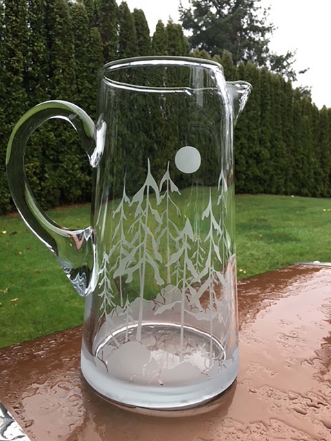 Dave and I began our artistic journey many years ago. We began with woodworking, added jewelry but then discovered the process of sand carving glass. Exploring this new creative inspiration with vigor we began developing designs, cutting our own stencils and sand blasting each piece individually. The Glass and Jewelry are mediums that offer infinite possibilities for growth and improvement which maintains our creative interest. Some more recent designs require up to 14 separate trips to the sand blaster, giving the finished product a unique three dimensional look.