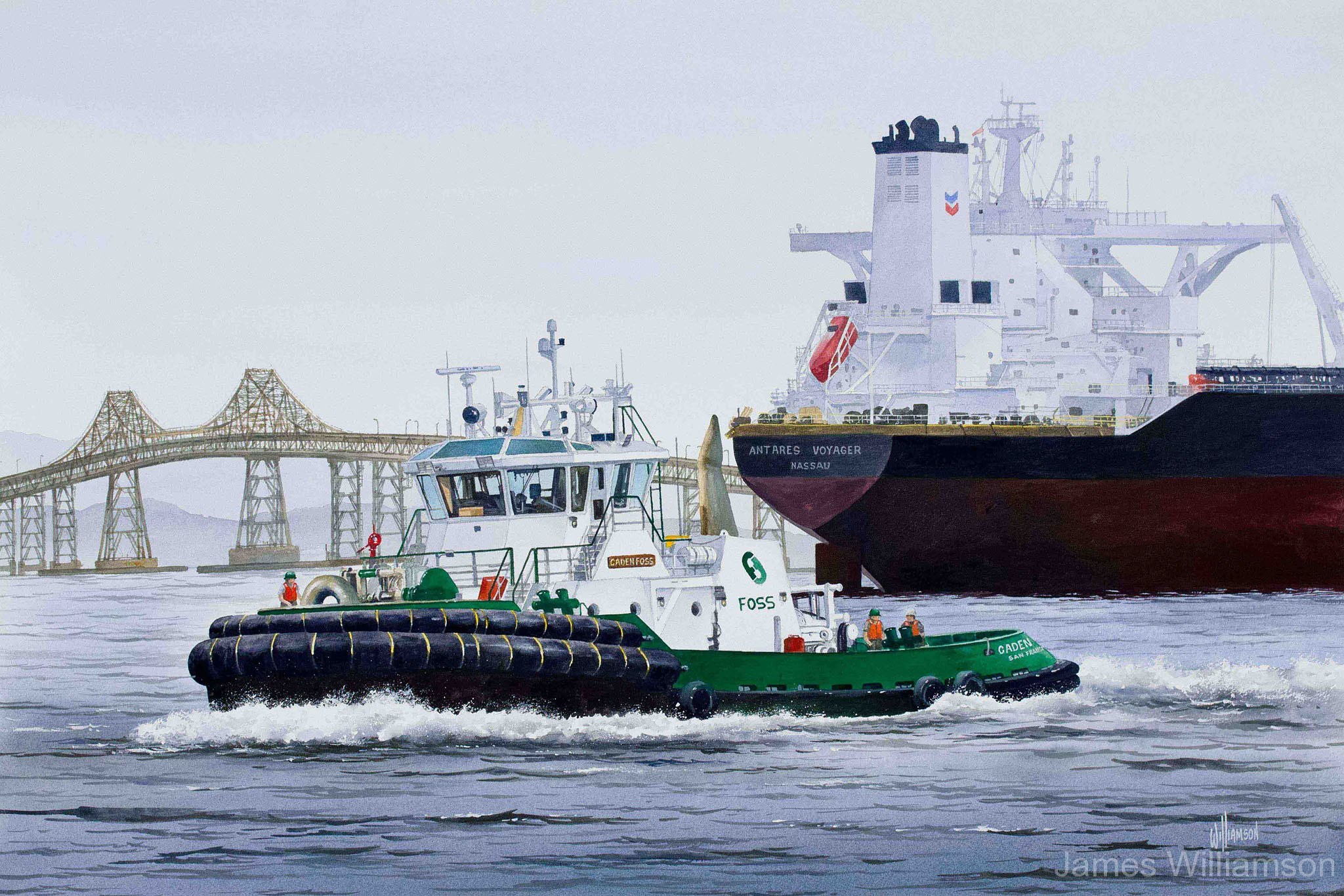 I have created artwork for companies such as: FOSS Maritime, Boeing, Raytheon, Conoco-Phillips, Exxon, HORIZON Shipping Lines, SAMSON Tug and Barge, and Canada Steamship Lines, the United States Navy, Air Force and Coast Guard. My Original illustrations include tugboats, fishing vessels, rocket test facilities, oil refinery vessels and projects, and shipping companies. My originals and limited editions hang in thousands of executive offices, boardrooms, bank lobbies, government buildings, fashionable restaurants and private residences throughout the United States and many other countries. I have also created illustrations for posters, greeting cards, telephone calling cards and credit cards issued throughout the world.