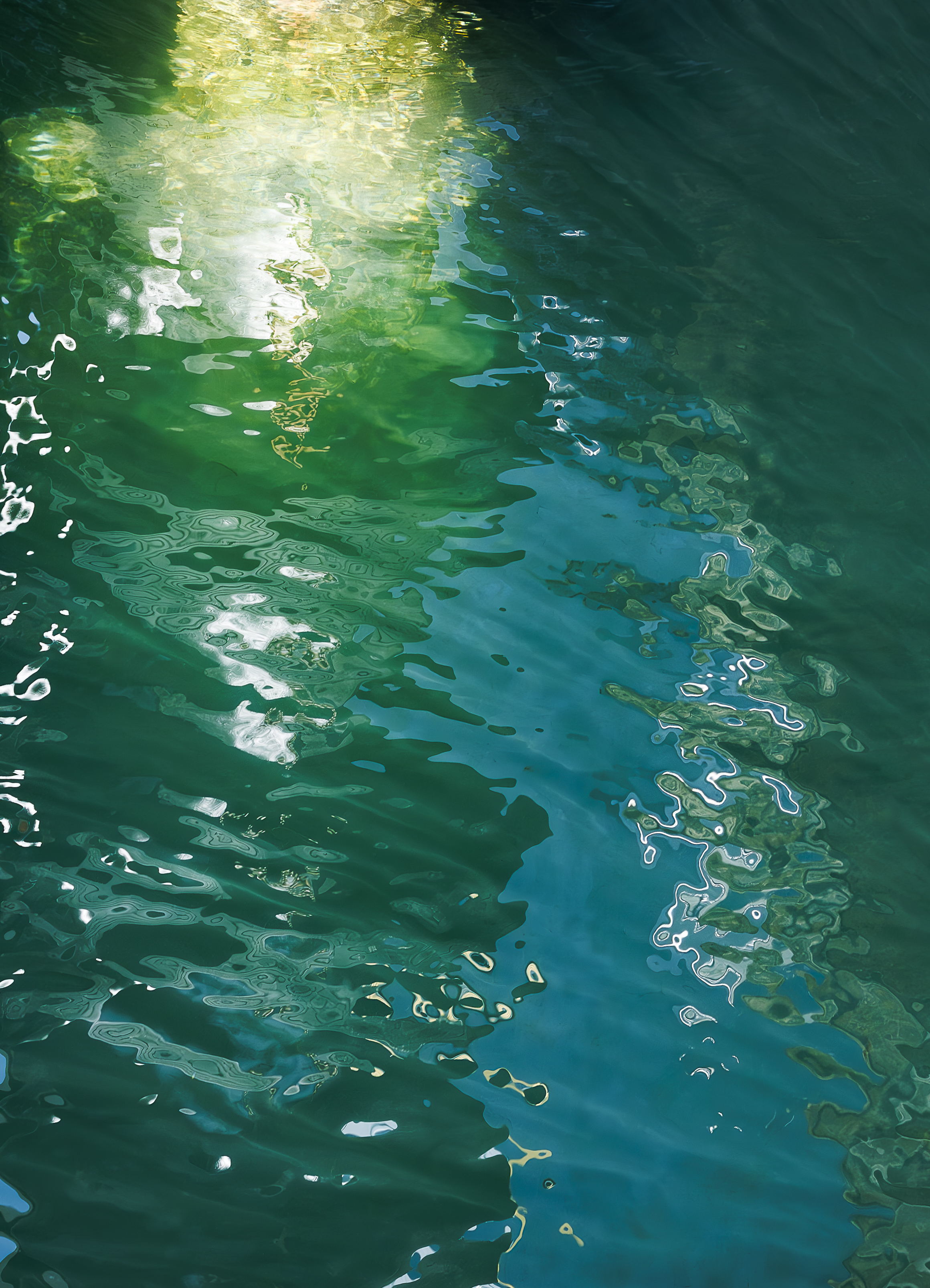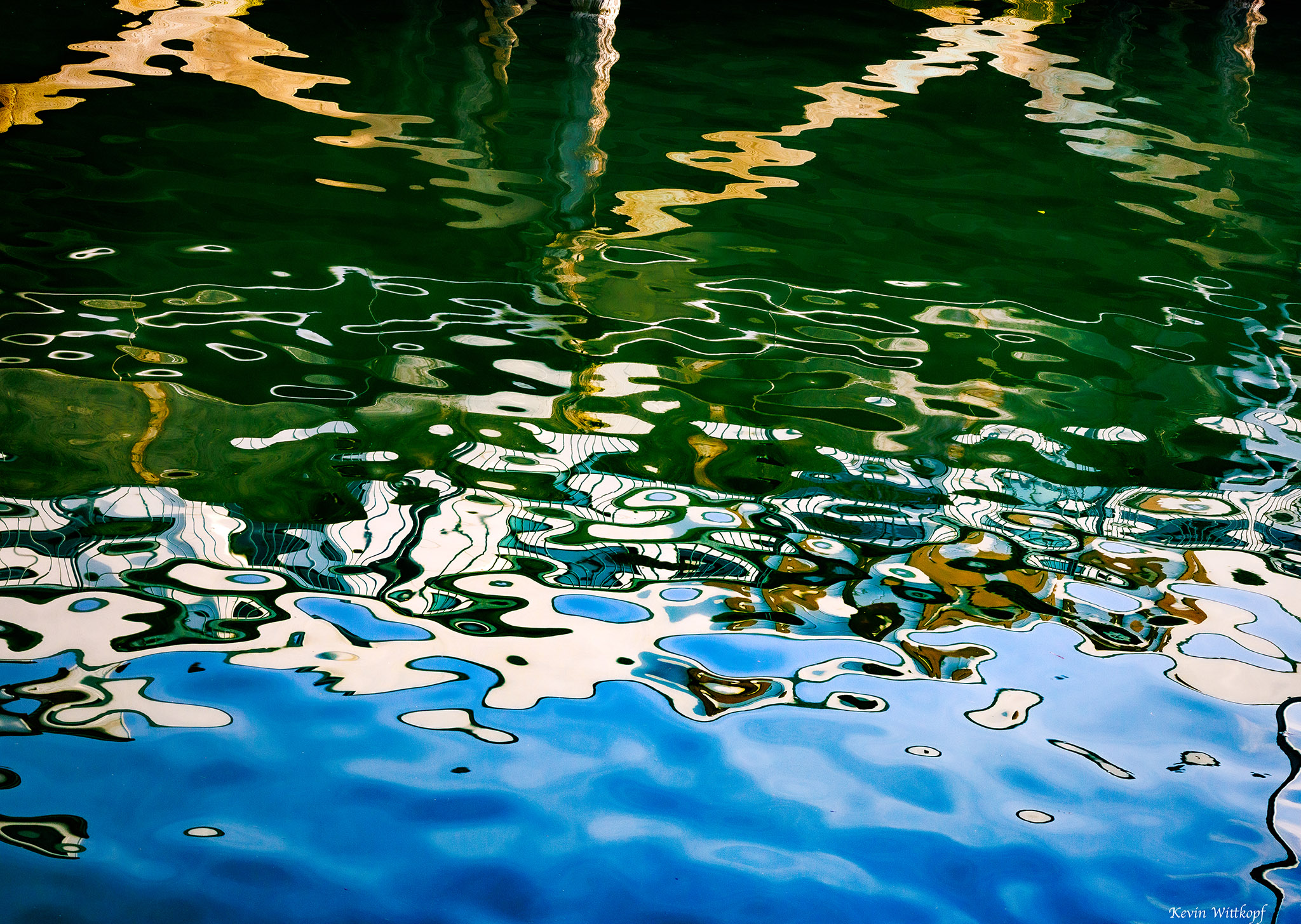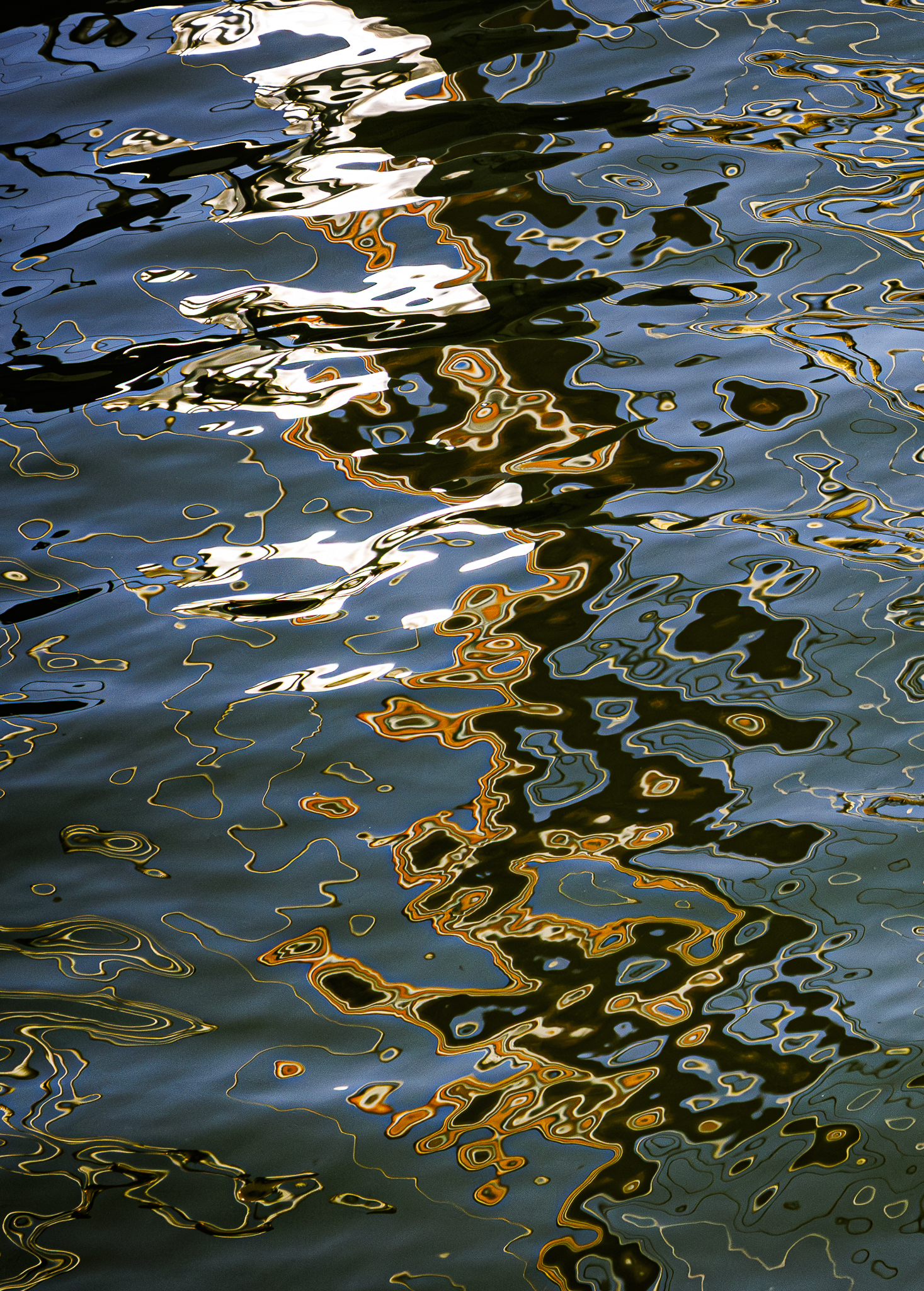 The surface of water has magical qualities…it is truly ‘fluid’, undulating and shifting, and reflects any light that reaches it, either directly from the sun, or from man-made objects, people…anything nearby. Waves, wind, birds, boat wakes… they all continuously affect how the water lies, moves, changes, and most importantly, reflects light. Also, what is seen and reflected is completely dependent on the viewer’s position… shift a few inches over, and it can look significantly different.